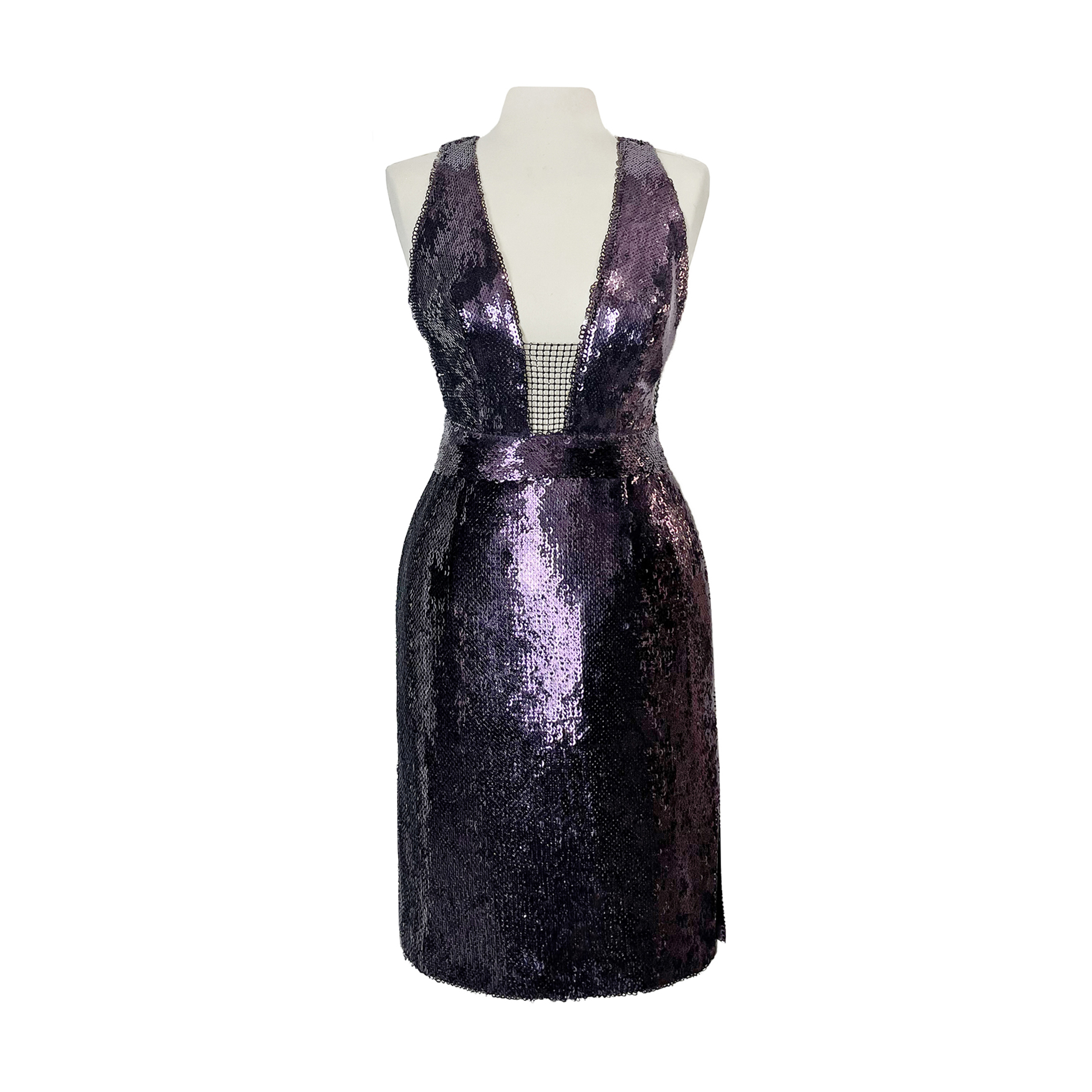 Fioletowa wieczorowa sukienka wykonana z cekinów oraz wstawki z siatki z kamieniami