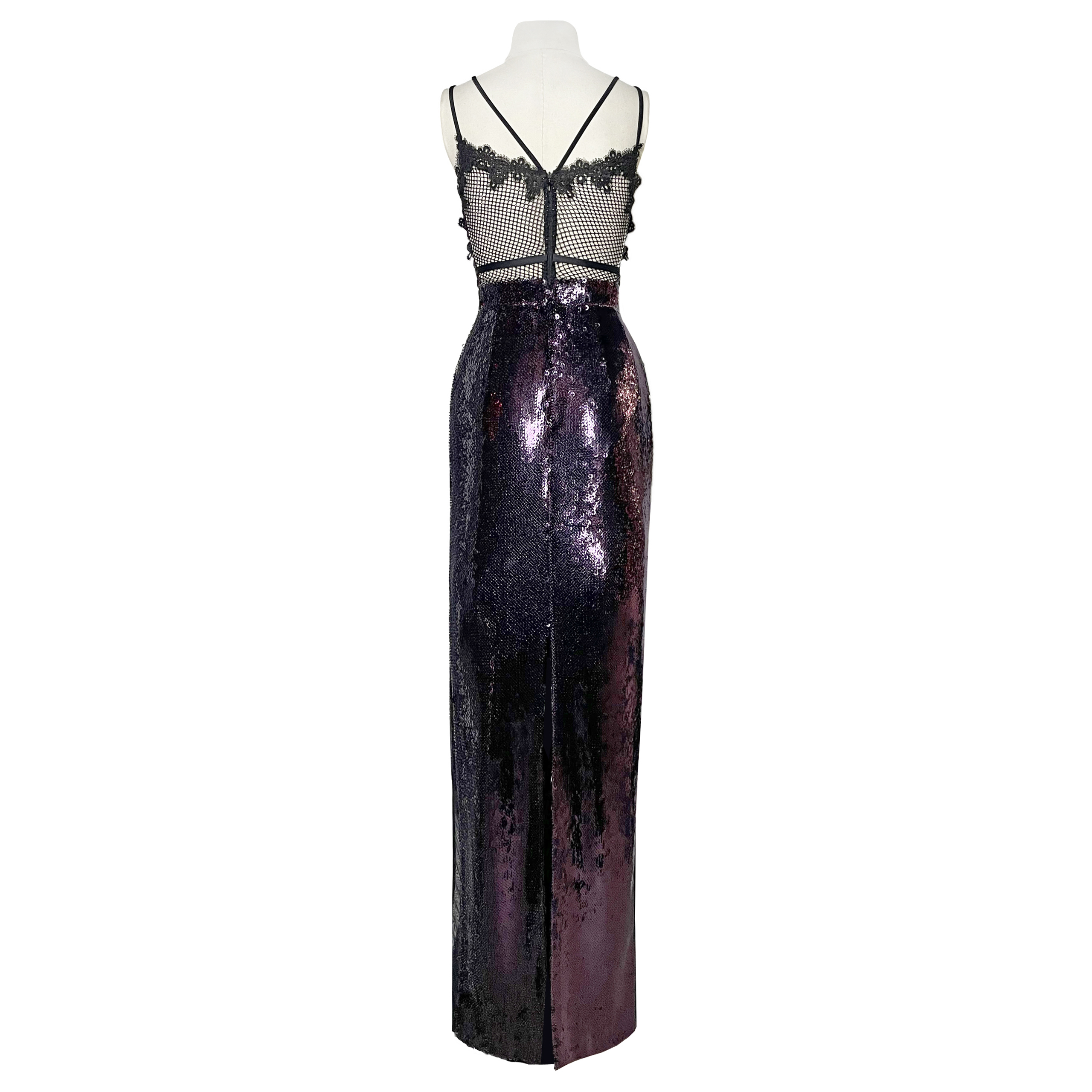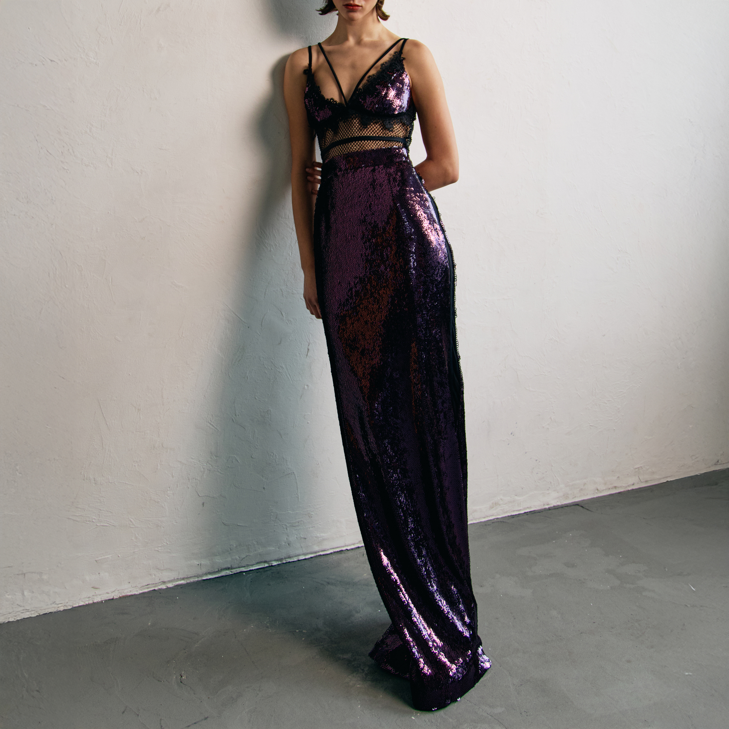 Fioletowa wieczorowa sukienka wykonana z cekinów i elementów koronkowych najwyższej jakości